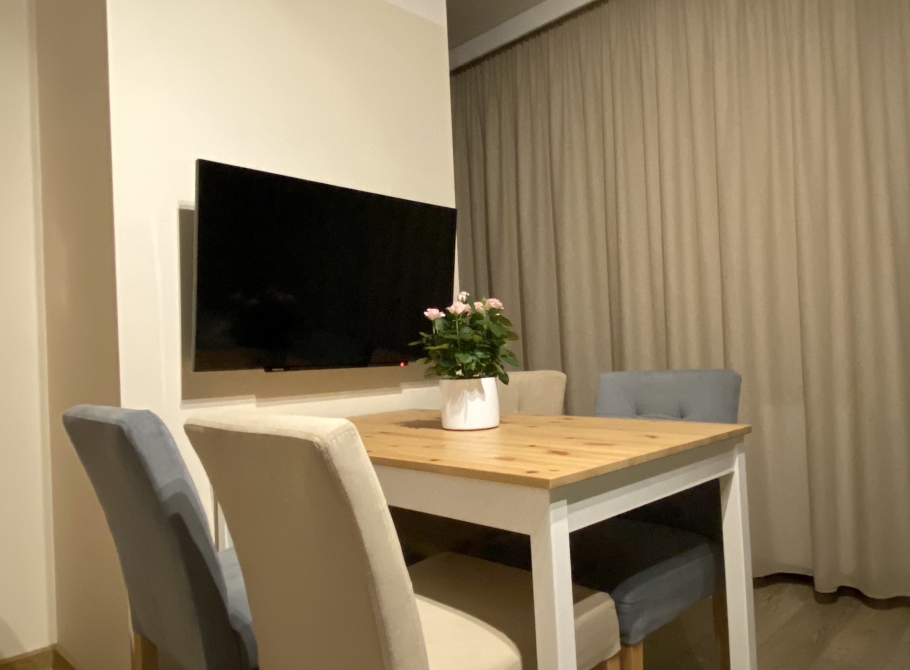 Nowocześnie urządzony apartament wyposażony został w wygodne łóżko dwuosobowe oraz dwa oddzielne, aneks kuchenny, łazienkę z prysznicem oraz bezpośrednie wejście na taras lub balkon.